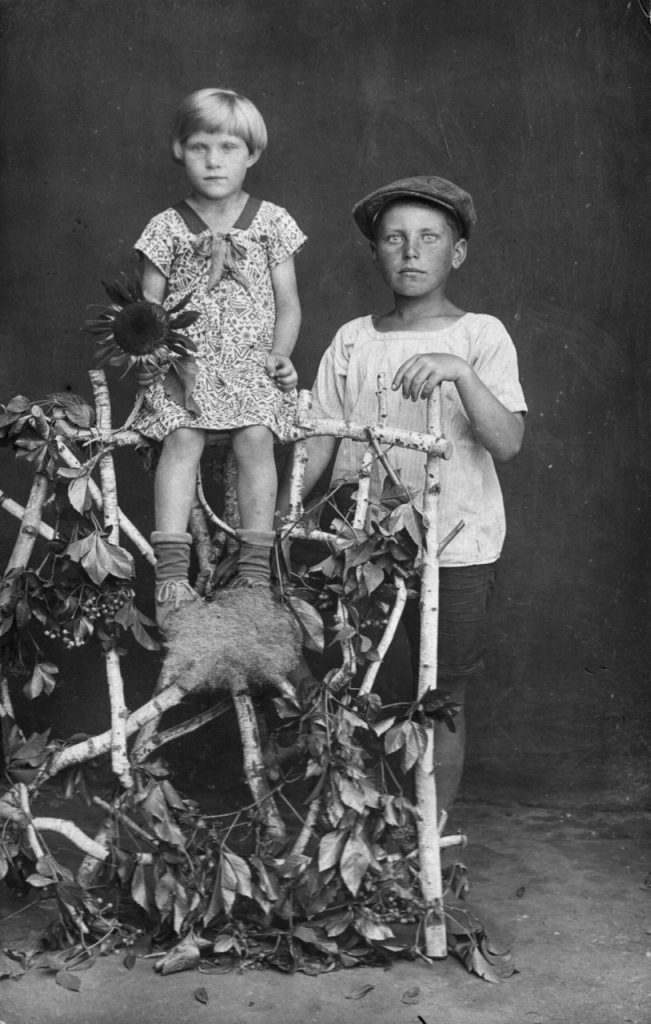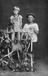 siblings pose in front of some wooden fence type thingie