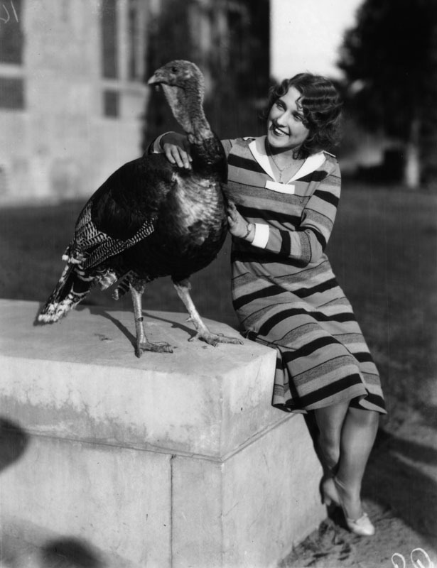 a woman sits next to a wild turkey from the Los Angeles Poultry Show, her arm around its neck as it gazes away from her, 1920s