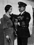 Deputy Chief of Police James Davis, President of the Los Angeles Police Revolver Club, shows Alice Briswalter one of the prizes to be awarded in the club’s third annual Christmas turkey shoot. Some 350 turkeys will be awarded at the shoot, on the Elysian Park Range. Other prizes include ducks, chickens, hams and candy, 1932