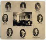 White Castle office employees. Located at the home office in Wichita, Kansas. Photograph was taken in the 1920s. Pictured clockwise from top left is Opal Horne, Lois Dahmer, Esther Unsell, Claude R. Rice, Leo F. Smith, Vercil R. Horne, Ralph Parker, and Loyd W. Roy