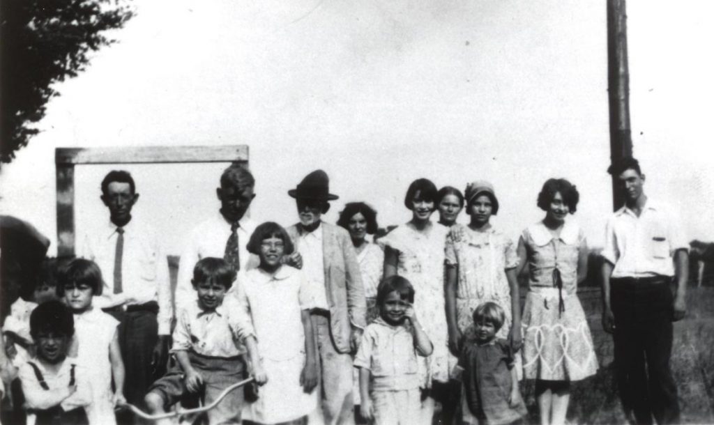 Grove family members in 1929 – back row, left to right, Christopher George, Arthur Patrick with their father Christopher Charles Grove and other members of the growing family