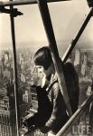 American photographer Margaret Bourke-White (1904 – 1971) stands on the scaffolding enclosing the then-under-construction Chrysler Building and looks out across New York, New York, 1931. She wears a leather jacket and holds a Graflex 3-¼ x 4-¼ RB Auto camera. The building visible at the lower left is the Helmsley Building (also known as the New York Central Building and the New York General Building)