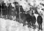 Skiers in Ione, Washington, 1928-1929 – Mr Hanson, M Danielson, Mrs Hanson, Mary Conway, H Danielson, Mary Magee, Nonie Bragg, V Golden, F Spalding, David Anderson, Irvin Olson