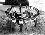 Russian composer Dimitri Tiomkin (May 10, 1894 – November 11, 1979) plays piano on a Santa Monica beach during a ballet rehearsal. The ballet dancers, members of the Albertina Rasch Ballet, encircle the composer