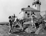 Here the world class athlete is not holding the pose but the brush. Seattle swimmer Helene Madison (June 19, 1913 – November 27, 1970) may actually be painting the joyful creature on the rocks, although it is hard to hold one’s arms so for long. Madison learned to swim in Green Lake and went on to break 117 US and world freestyle swimming records when still in her teens. In 1932 she won three gold medals at the Olympic Games in Los Angeles