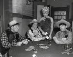 Columbia Pictures publicity photo of Shemp, Larry and Moe and playing poker as Marion Martin helps Larry cheat, signed and inscribed in blue ballpoint ’To Frank Serpe, Sincerely, The 3 Stooges, Moe,’ and ’Shemp’ and ‘Larry’ with Moe signing for Shemp and Larry