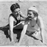 ‘Stormy Weather’ may be one of the most popular ditties, but Ozzie Nelson prefers his weather to be fine when he and Harriet Hilliard, his featured vocalist, holiday on the beach. THe conductor and Miss Hilliard are enjouing a sun-bath on the beach in Palisades Park, July, 1933