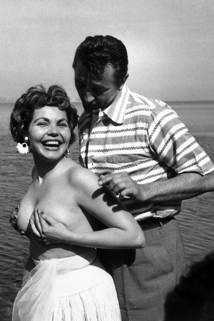 Robert Mitchum (August 6, 1917 – July 1, 1997) can do nothing but watch as Simone Silva covers her cans at the 1954 Cannes Film Festival