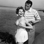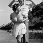 Robert Mitchum (August 6, 1917 – July 1, 1997) can do nothing but watch as Simone Silva covers her cans at the 1954 Cannes Film Festival