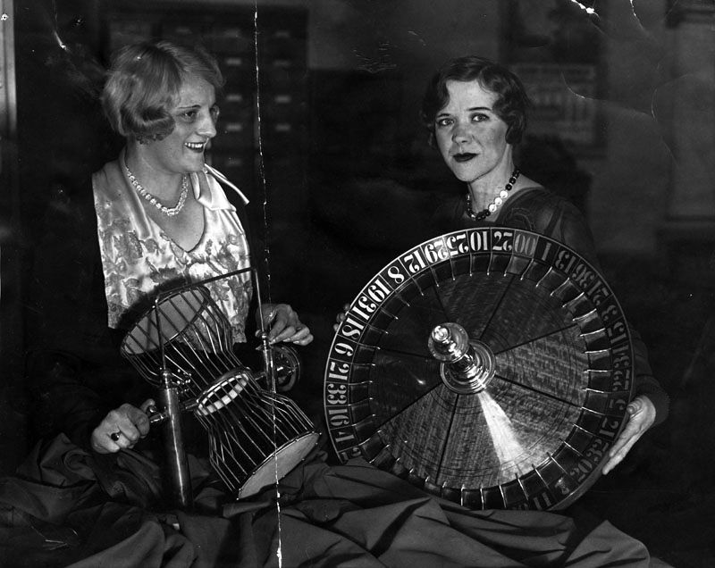 Dorothy Adams, a secretary at the district attorney’s office, shows a roulette wheel seized aboard the Rose Isle, one of the gambling boats off Long Beach which was raided by officers. Seven men were arrested. photo dated – December 27, 1930