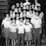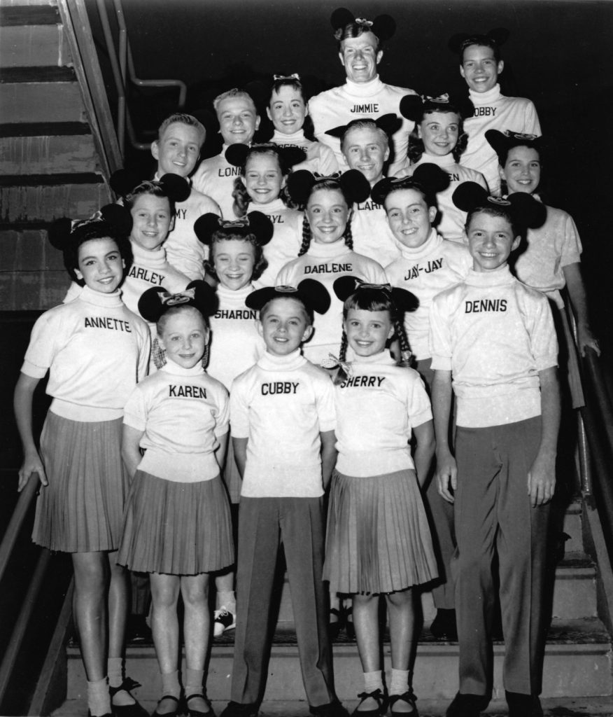 (Front row; L–R) Annette Funicello, Karen Pendleton, Cubby O’Brien, Sherry Alberoni, Dennis Day. (Second row; L–R) Charley Laney, Sharon Baird, Darlene Gillespie, Jay-Jay Solari. (Third row; L–R) Tommy Cole, Cheryl Holdridge, Larry Larsen, Eileen Diamond. (Fourth row; L–R) Lonnie Burr, Margene Storey, Doreen Tracey. (Fifth row; L–R) Jimmie Dodd and Bobby Burgess
