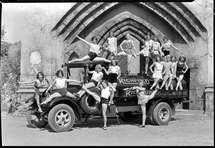 whataboutbobbed July 19, 2013 losangelespast: Models cavorting on a Richfield Oil truck on the RKO backlot, Los Angeles, 1929