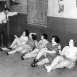 an act which is liable to bring down the house, (with a crash), is the Tiny Rosebuds, at present rehearsing in New York for a Buffalo appearance. Membership in the troupe is restricted to young ladies weighing at least 200 pounds. Here is the troupe relaxing after a light (heavy) workout. Left to right, are: Nick Elliott, instructor: Hieni Joyce, wgt. 215: Bobbie Diamond, Captain, wgt. 210: Fannie De Belis, wgt. 201: Tiny Sinclair, wgt. 240: and Dorothy Baer, wgt. 230.