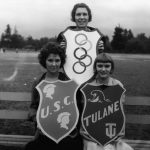 a pre-Olympics publicity event featured in the 1932 Tournament of Roses, proclaiming the Xth Olympiad, the 1932 Olympic Games, to be held in Los Angeles. Here models hold signs for the Olympics, and for U.S.C. and Tulane, rivals in the Rose Bowl football game