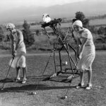 Penny Singleton, known as Dorothy McNulty in the early part of her career (right) and another actress take lessons on their golf swings from a mechanical instructor in a scene from the musical comedy Love in the Rough, directed by Charles Reisner, 1930