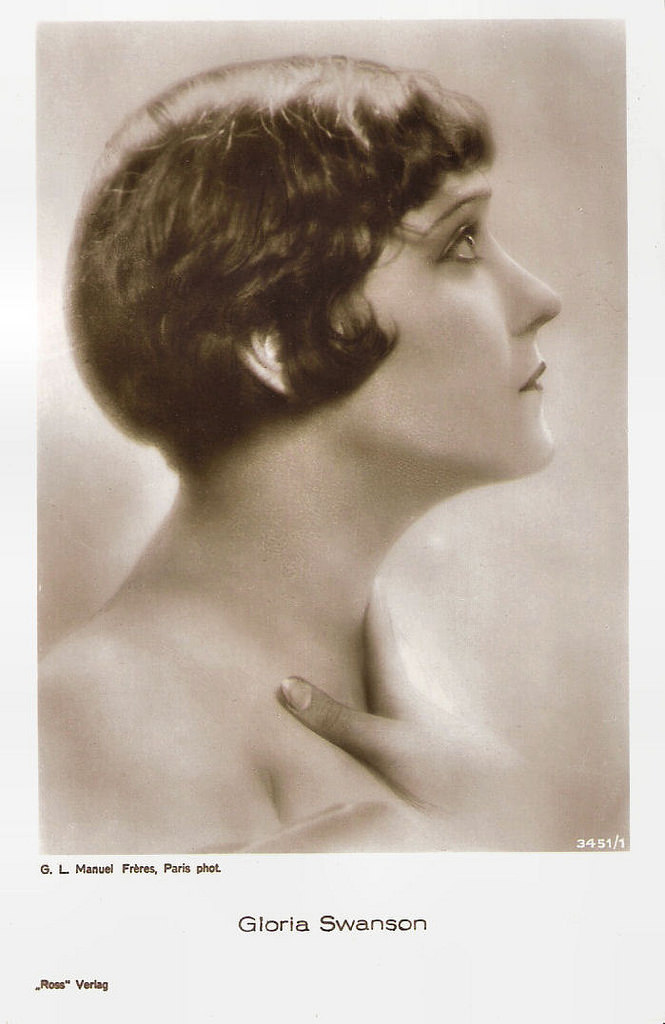 German postcard by Ross Verlag, no. 3451/1, 1928-1929. Photo: G.L. Manuel Frères, Paris.Gloria Swanson (1899-1983) was one of the biggest Hollywood stars of the silent era. She transformed from a typical Mack Sennett comedienne into a lively, provocative, even predatory, star in films by Cecil B. De Mille. She received Oscar nominations for Sadie Thompson (1928), The Trespasser (1929) and Sunset Blvd. (1950).
