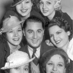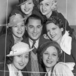 six LeRoy Prinz dancers were recently given contracts as stock actresses at Paramount studio because of their all-around beauty and ability to act. They are shown with Prinz, dance director. Left to right, bottom, Esther Pressman, Dene Myles, middle, Kay Gordon, Prinz, Beula McDonald, top, Dorothy Thompson and Bonita Barker, March 5, 1935
