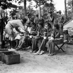 sixteen women textile strike pickets, imprisoned with 112 men by Georgia National Guardsmen on charges of trying to keep workers from entering a cotton mill at Newnan, Georgia, are shown eating their dinner at their prison camp near Atlanta. They were members of the strikers’ ‘Flying Squadrons’ which traveled from mill to mill urging workers to leave their machines. photo dated September 19, 1934