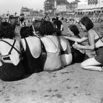 whataboutbobbed August 11, 2016 lady sunbathers line up on the beach for some sun cream application, August 11, 1934