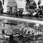 Aquatic Checkers – the old-fashioned game of checkers took to the water in a novel tourney at Palm Springs, California, in which many movie stars took part. Boards and contestants are both floating during the play. Above is Richard Arlen and his wife, Jobyna Ralston, both film players, during the opening round. December 13, 1932