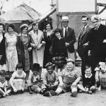 Little Rascals Dorothy, Dickie Jackson, Mary Ann Jackson, Stymie (Matthew Beard Jr), Allen ‘Farina’ Hoskins, Norman ‘Chubby’ Chaney, Bobby ‘Wheezer’ Hutchins, and Pete the Pup, with Bob McGowan, Ben Shipman (Laurel’s and Hardy’s manager) and some visitors in 1931