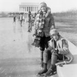 whataboutbobbed January 26, 2018 Abbey Jackson, seated, and Celene DuPuy ice skating on reflecting pool, with Lincoln Memorial in background