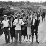 Mystery Hike No. 2 was from Valley Heights in the lower Blue Mountains along the old Lapstone Road to Penrith on 10 July 1932. Four trains conveyed approximately 2,000 hikers. This photo shows a group of hikers walking across a railway bridge. There are houses in the background.