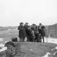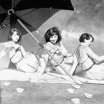 whataboutbobbed September 17, 2018 three ‘Spruce Girls’ wearing wood veneer bathing suits sitting under an umbrella and holding wooden boards shaped like feet, Hoquiam, Washington photo by Vern C Gorst, circa 1929