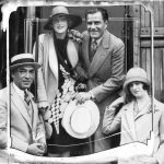 first pictures of Bert Lytell, movie star, and Claire Windsor, actress, (at top) taken after their secret wedding in Jaurez, Mexico, while boarding the train for Mexico City where they will spend their honeymoon. Edwin Carewe, director, and his fiance, Mary Aiken, (shown below) are accompanying the couple to the Mexico capitol