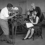 whataboutbobbed October 16, 2018 May 28, 1928 – USC President Rufus B. von KleinSmid stands behind actress Anita Page as she takes her first lesson at the university’s school of speech as Hollywood moves from silent films to talkies