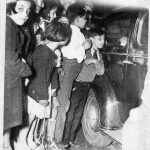May 15, 1937: Helen Tiernan, a single mother of two, was trying to get her boyfriend, a Greek immigrant named George Christodulus — a.k.a. George Christie — to marry her. George (seen below right, in black hat) didn’t want the kids. So Helen (below left, in light-colored coat) told her children they were going on a picnic, took them into the Long Island woods, stabbed both, and set her daughter afire. The girl, who was 7 and also named Helen, died; the son, Jimmy, age 4, survived. The elder Helen got 20 years to life. Her confession let George off the hook, whereupon he was put up for deportation back to Greece. Jimmy went to a foster home. The kids peering into the car (seen above) are jeering at George after his arrest.