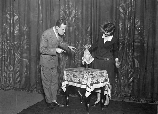 British stage magician Noel Maskelyne (1899 – 1976, left) and fellow illusionist Oswald Williams (1880 – 1934, centre) teach Noel’s sister Mary (later Mrs. Sterndale Bennett) how to palm objects, UK, 7th October 1927. Noel and Mary’s father was famous magician Nevil Maskelyne, and their brothers Jasper and Clive are also stage magicians.