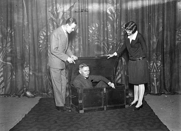 British stage magician Noel Maskelyne (1899 – 1976) and his sister Mary (later Mrs. Sterndale Bennett) perform the famous box trick, by shutting fellow illusionist Oswald Williams (1880 – 1934) in a trunk, UK, 7th October 1927. Their father was famous magician Nevil Maskelyne, and their brothers Jasper and Clive are also stage magicians.
