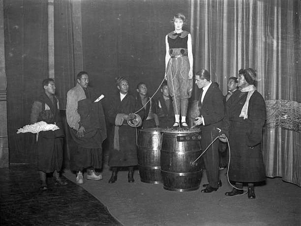 British stage magician Noel Maskelyne (1899 – 1976) watches his sister Mary (later Mrs. Sterndale Bennett) perform the disappearing water trick, UK, 7th October 1927. Their father was famous magician Nevil Maskelyne, and their brothers Jasper and Clive are also stage magicians.