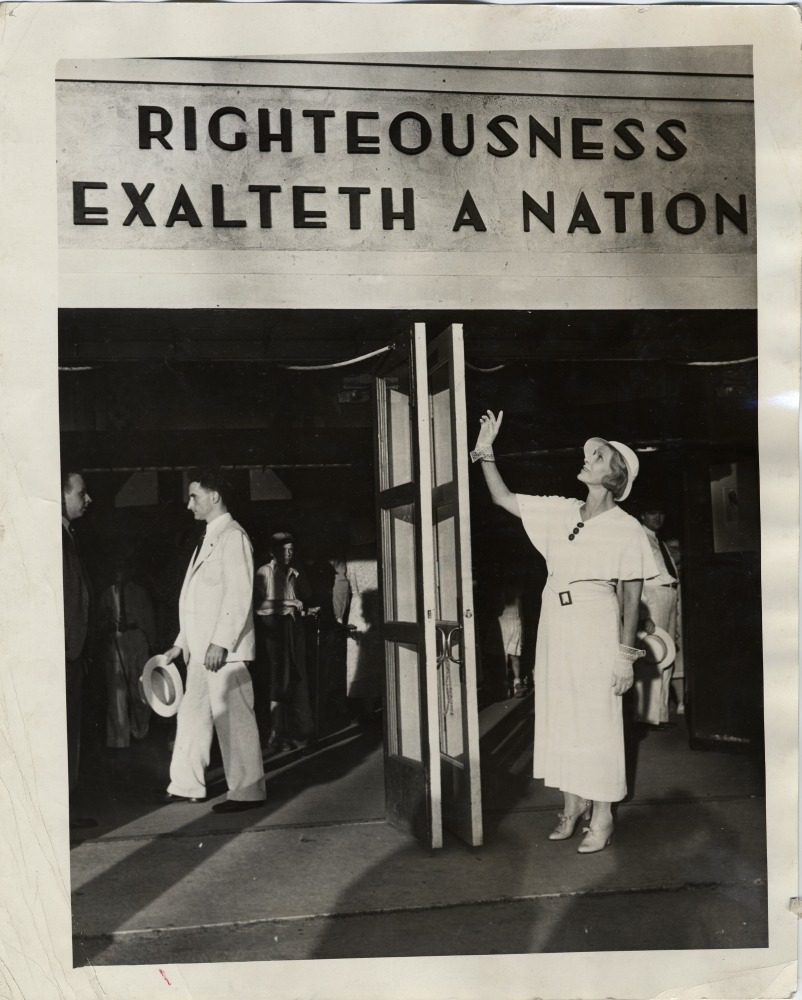 Sister Aimee Semple McPherson prepares to visit the Hall of Religion at the 1933 Chicago World’s Fair