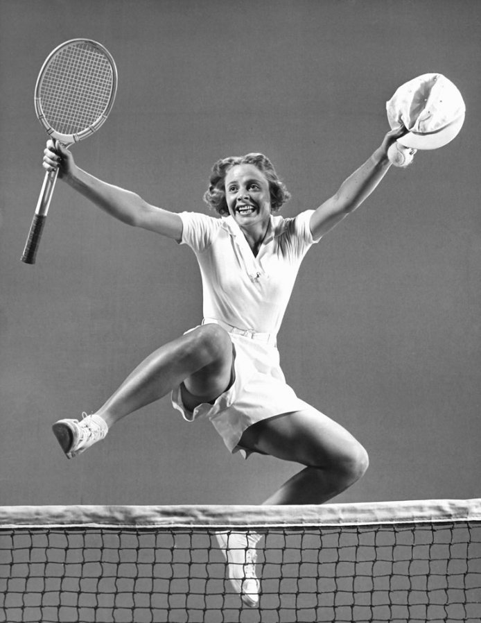 Alice Marble (September 28, 1913 – December 13, 1990) jumps for joy in 1939, and is up to bat with Lefty O’Doul in 1938