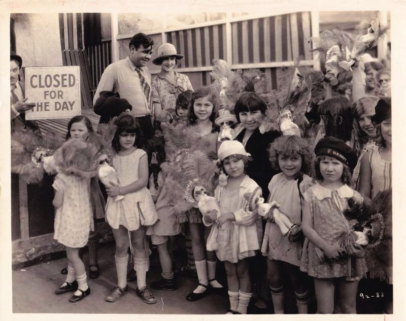 Babe Ruth receives royal welcome from children at the Marion Davies Clinic for children of World War veterans. Ruth plays in baseball games for charity to benefit the clinic, 1931