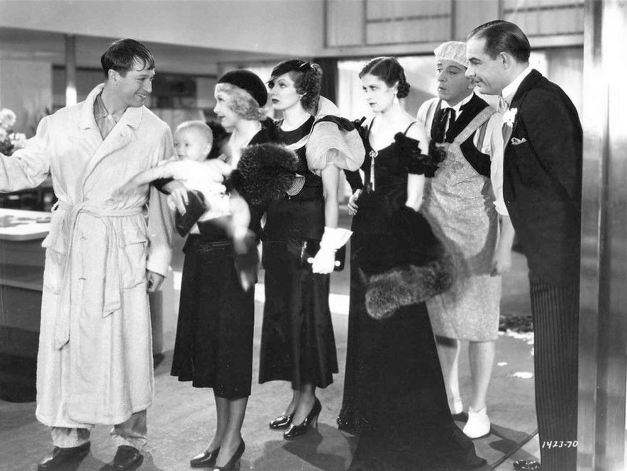 Helen Twelvetrees holds Baby LeRoy as Maurice Chevalier, Adrienne Ames, Leah Ray, Edward Everett Horton and Earle Foxe all want to hear A Bedtime Story (1933)