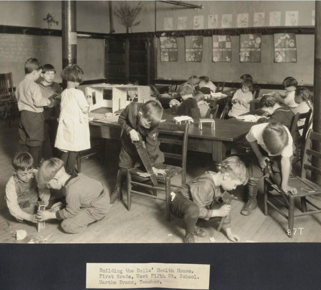 building the Dolls’ Health House. Miss Martha Evan’s First Grade class, West Fifth Street School, Mansfield, Ohio, 1920s