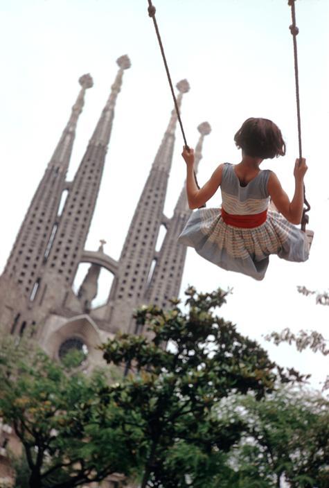 swinging by The Sagrada Familia, Barcelona, 1959. by Burt Glinn