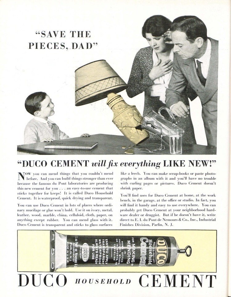 ’Save the pieces, Dad! DUCO CEMENT will fix everything LIKE NEW!’ a DuPont product highlighted in their own magazine, February 1931 DUCO!!!
