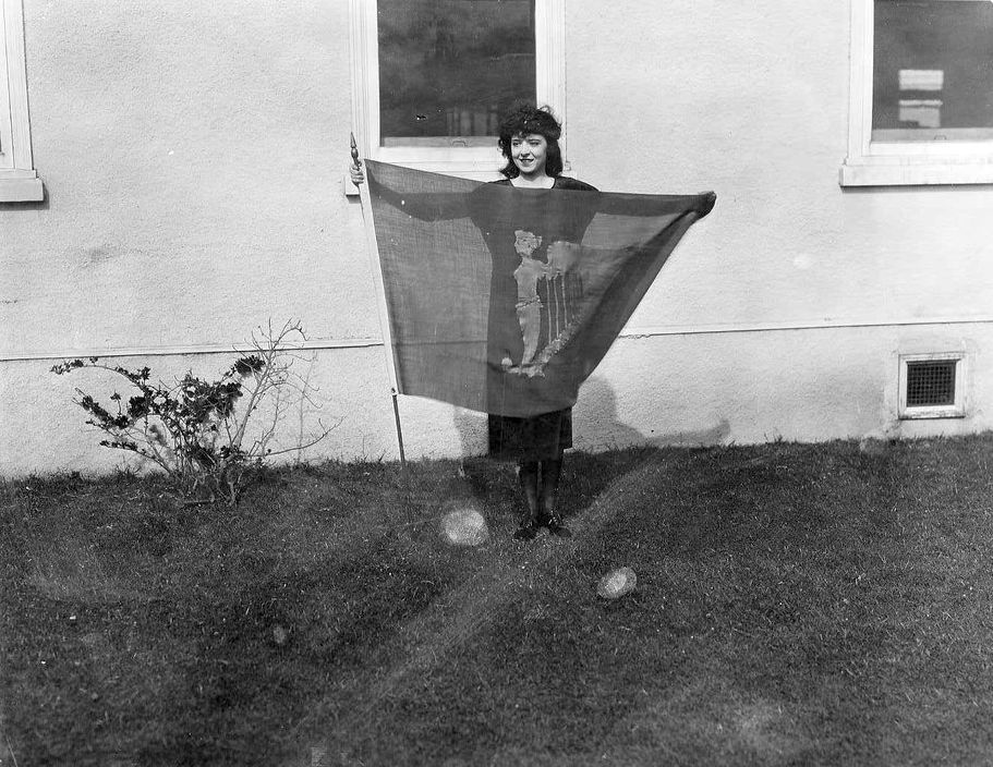 Colleen Moore holding an Irish and American flag outside the Goldwyn studio, during the filming of 1923’s Look Your Best