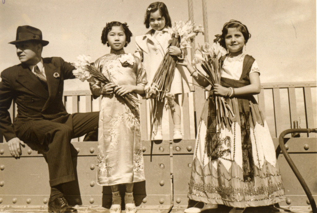 girls representing China, Canada and Mexico attend the ‘Last Rivet’ ceremony on the Golden Gate Bridge, April 27, 1937