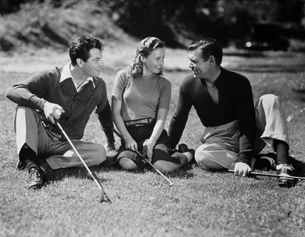 Barbara Stanwyck relaxes on a golf course with her husband Robert Taylor and Clark Gable, 1940