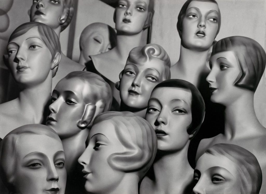 arrangement of 12 female mannequin heads, each with distinct physiognomy and period hair style photo by Peter Weller image restored by Kurt Tutschek for the fine folks at Freevious.org