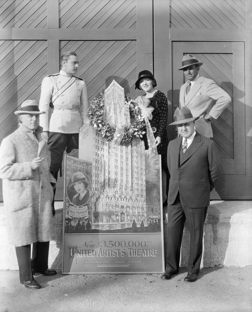 Douglas Fairbanks and Mary Pickford, along with D.W. Griffith and John Barrymore, proudly attend the inauguration of the United Artists Theater at Broadway and Ninth, New York City, 1927
