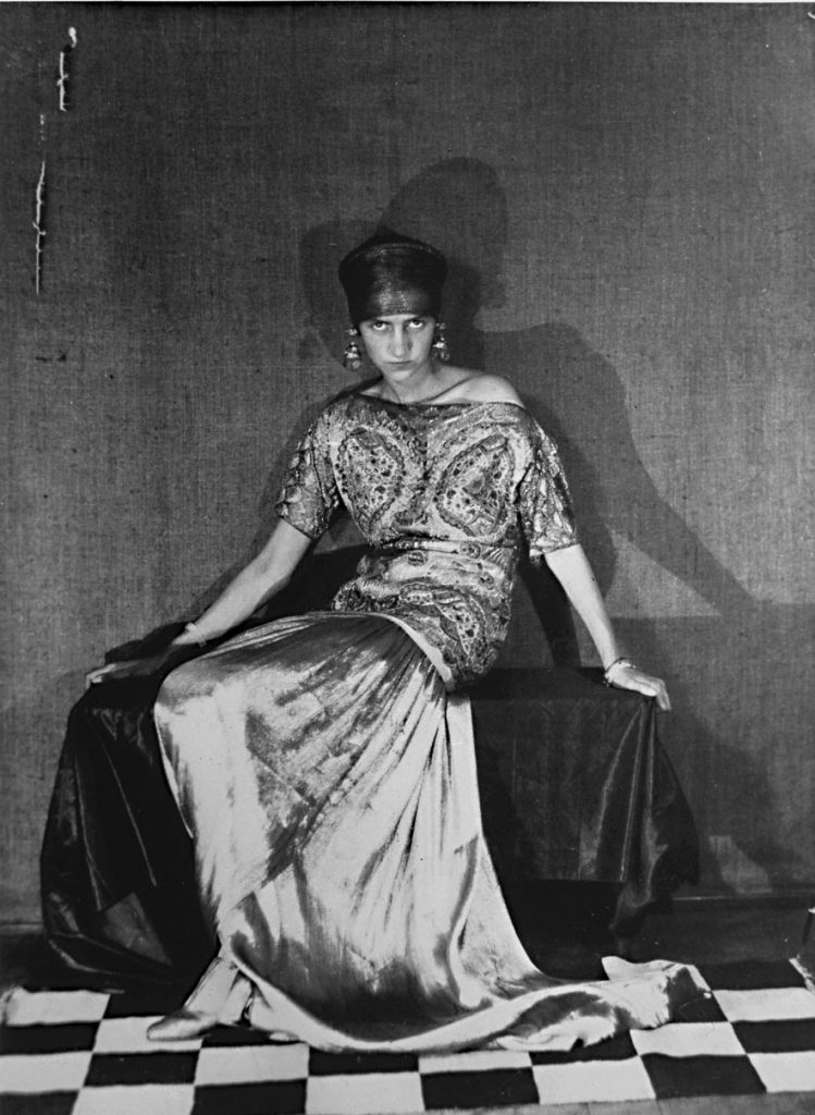 Peggy Guggenheim (August 26, 1898 – December 23, 1979) with Paul Poiret dress, posing for Man Ray