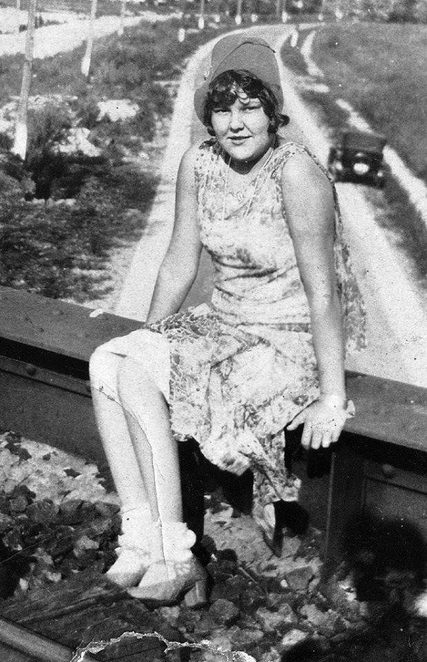 Mary Feeney of Kensington, Maryland sits on bumper of unidentified car license plate is DC appears to be style issued from 1928-1932