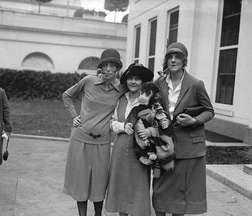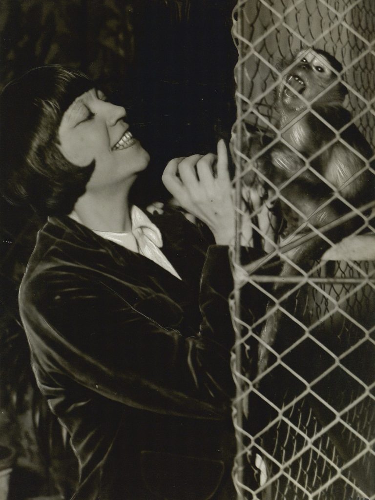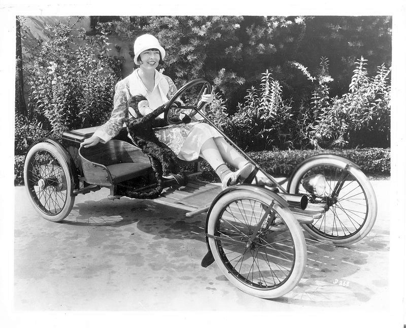 Colleen Moore monkeys around, riding in an electric car on the First National backlot while filming Synthetic Sin