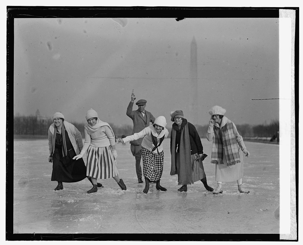 co-ed hockey on the iced-over Lincoln Memorial Reflecting Pool photo by Harris & Ewing, January 1922